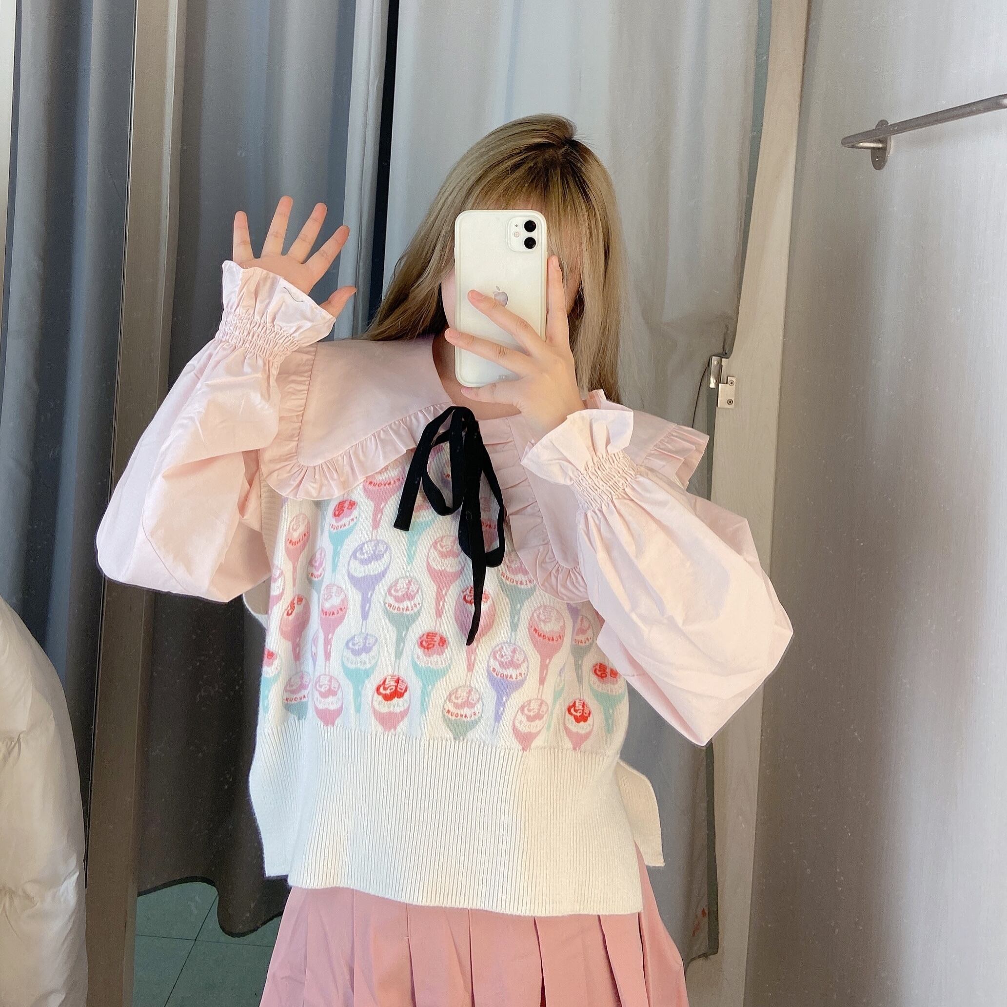 色:白い人形の襟のシャツ,ピンクの人形の襟のシャツ,ロリポッププリントベスト
