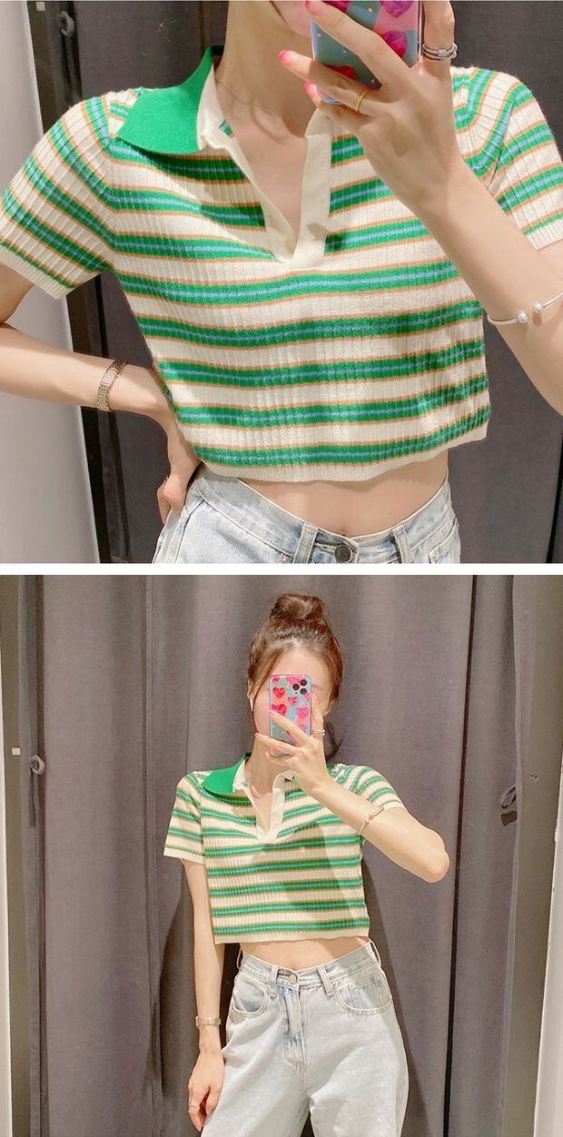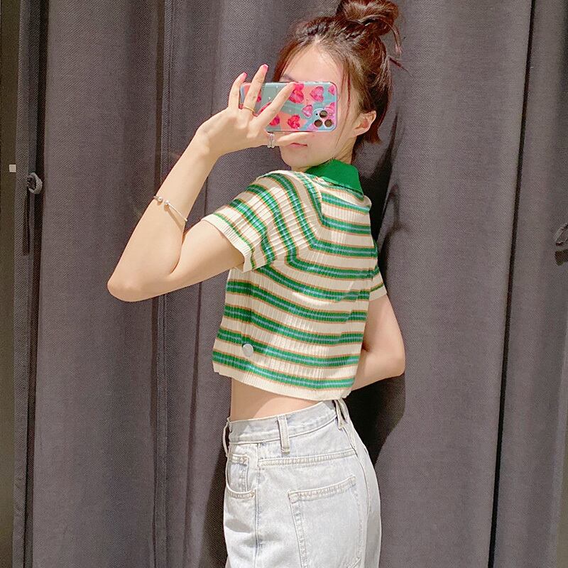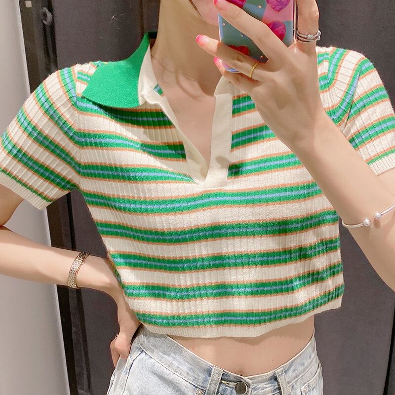 ストライプカラーショートニット半袖スリーブTシャツ トップス ハーフスリーブ アイドル ジャケット ブルゾン Tシャツ 長袖 半袖 デニム パンツ ワンピ キャミ オフショル ティアード ジーンズ スーツ ZARA フォーエバー21 GAP H&M WEGO HONEYS MUJI GU UNIQLO dholic babyGAP FOREVER21 Old Navy 春夏秋冬 韓国 K-POP Kpop 韓流 スター 27A64520209181 | 乙女家の洋品店