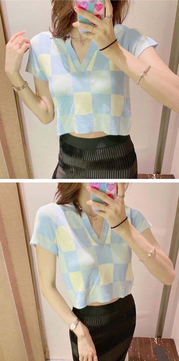 スタイルスタンダードVネック格子柄ショートニットTシャツ レトロ アイドル ジャケット ブルゾン Tシャツ 長袖 半袖 デニム パンツ ワンピ キャミ オフショル ティアード ジーンズ スーツ ZARA フォーエバー21 GAP H&M WEGO HONEYS MUJI GU UNIQLO dholic babyGAP FOREVER21 Old Navy 春夏秋冬 韓国 K-POP Kpop 韓流 スター 27A75219747273 | 乙女家の洋品店